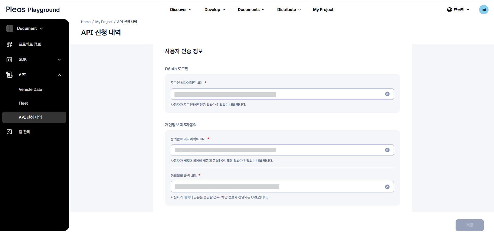 | redirectUrl | string | Pleos Playground > My Project에서 Vehicle Data API 사용 신청 시 입력한 OAuth 로그인 > 로그인 리다이렉트 URL을 입력합니다. | Required |