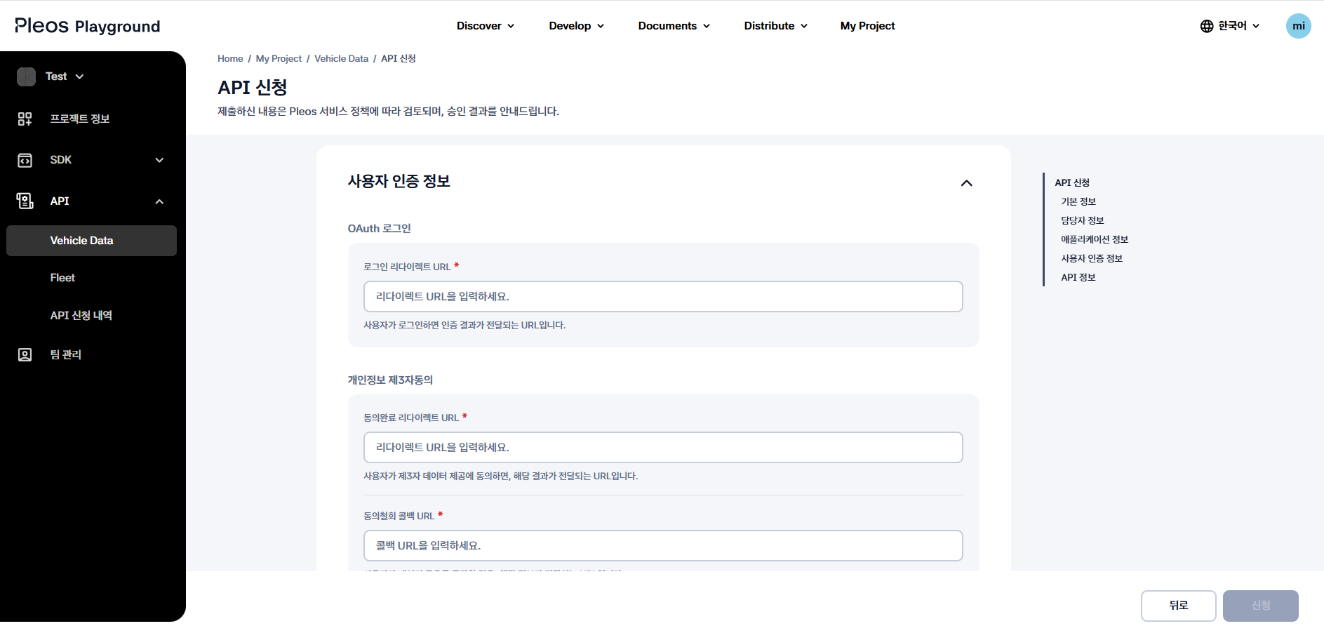 - API 신청 화면에서 사용 신청에 필요한 정보를 입력하고, 사용할 Vehicle Data API를 선택합니다.