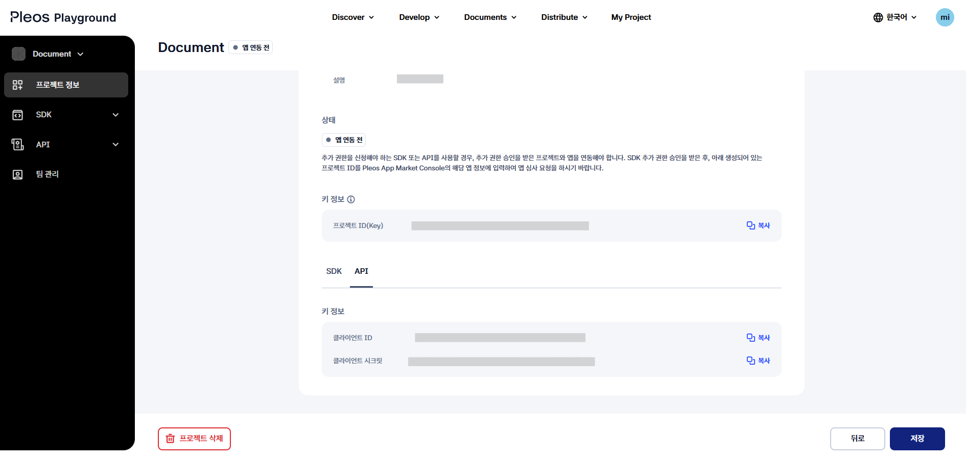 - 프로젝트 정보 화면에서 API 탭을 선택합니다.