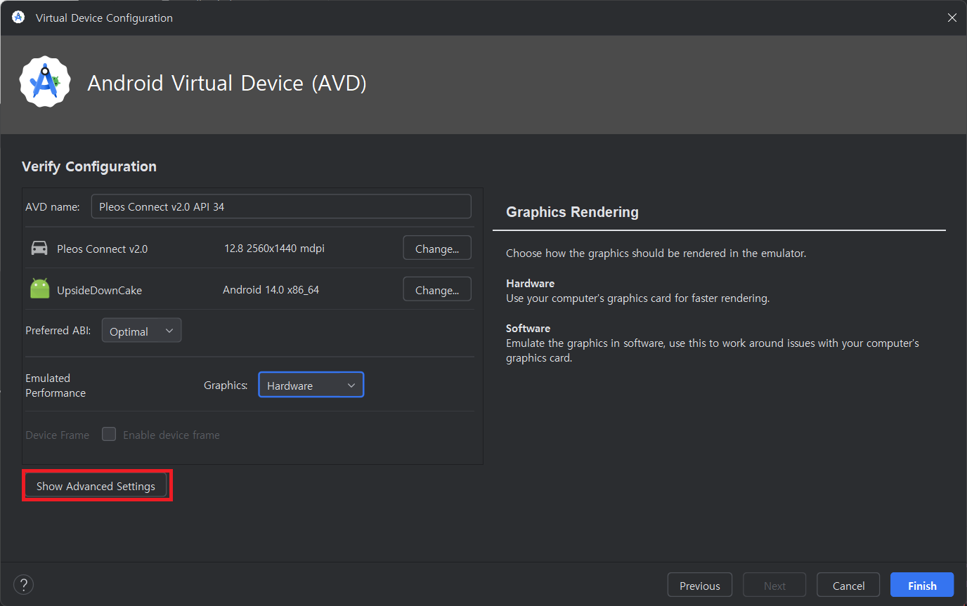Android API Level 34에 있는 Pleos Connect system Image를 체크합니다.
