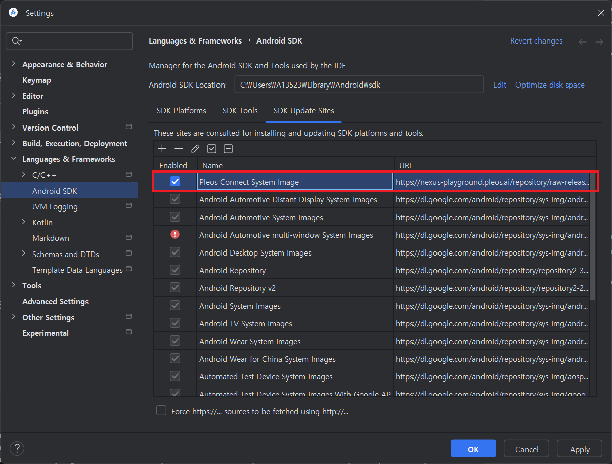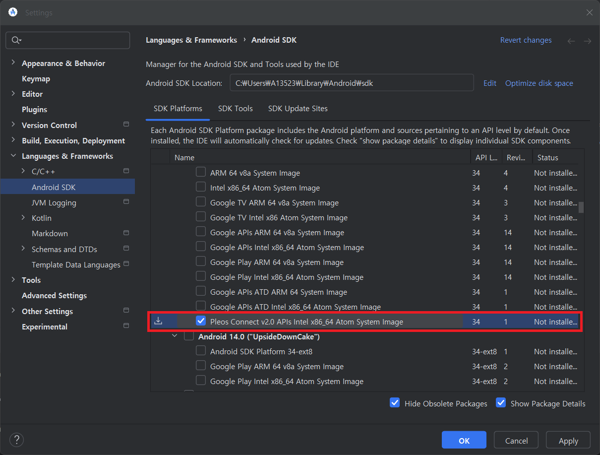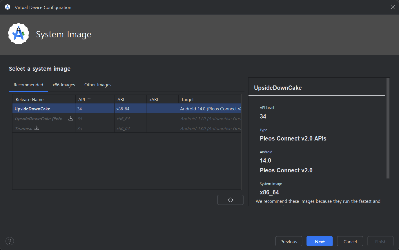 Check the Pleos Connect system Image for Android API Level 34.
