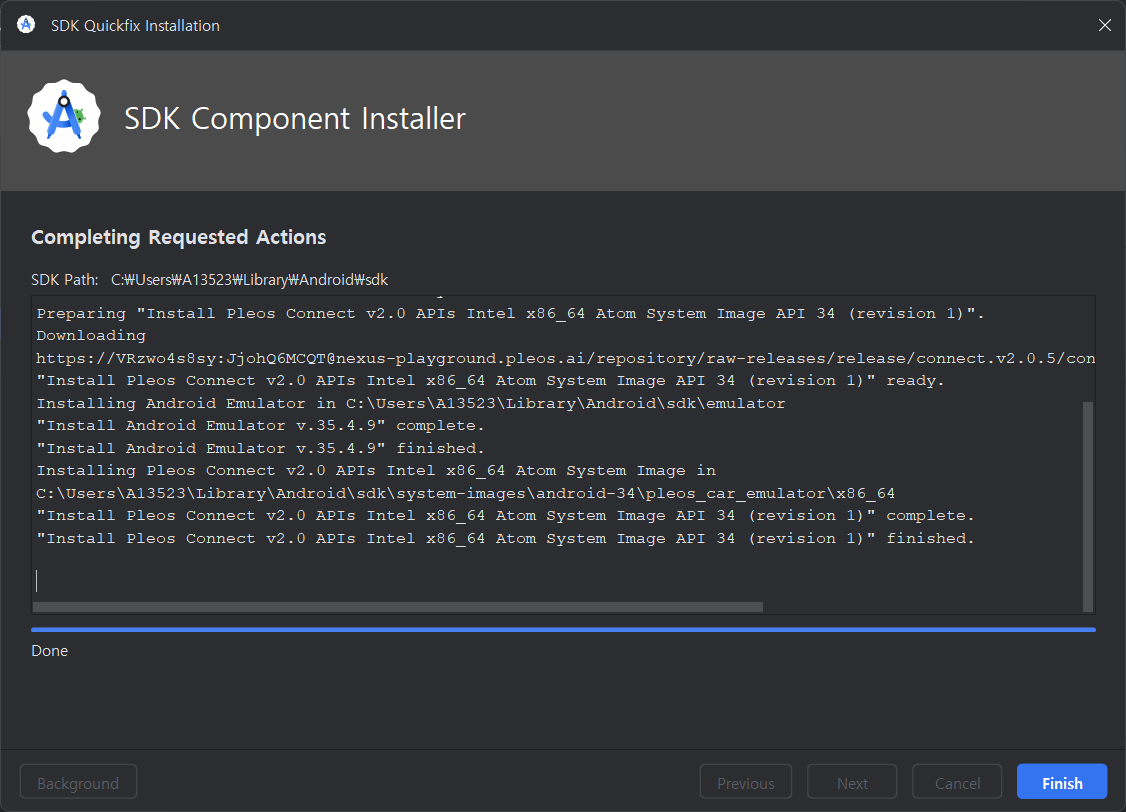 Once the download is complete, press the Finish button and restart Android Studio.