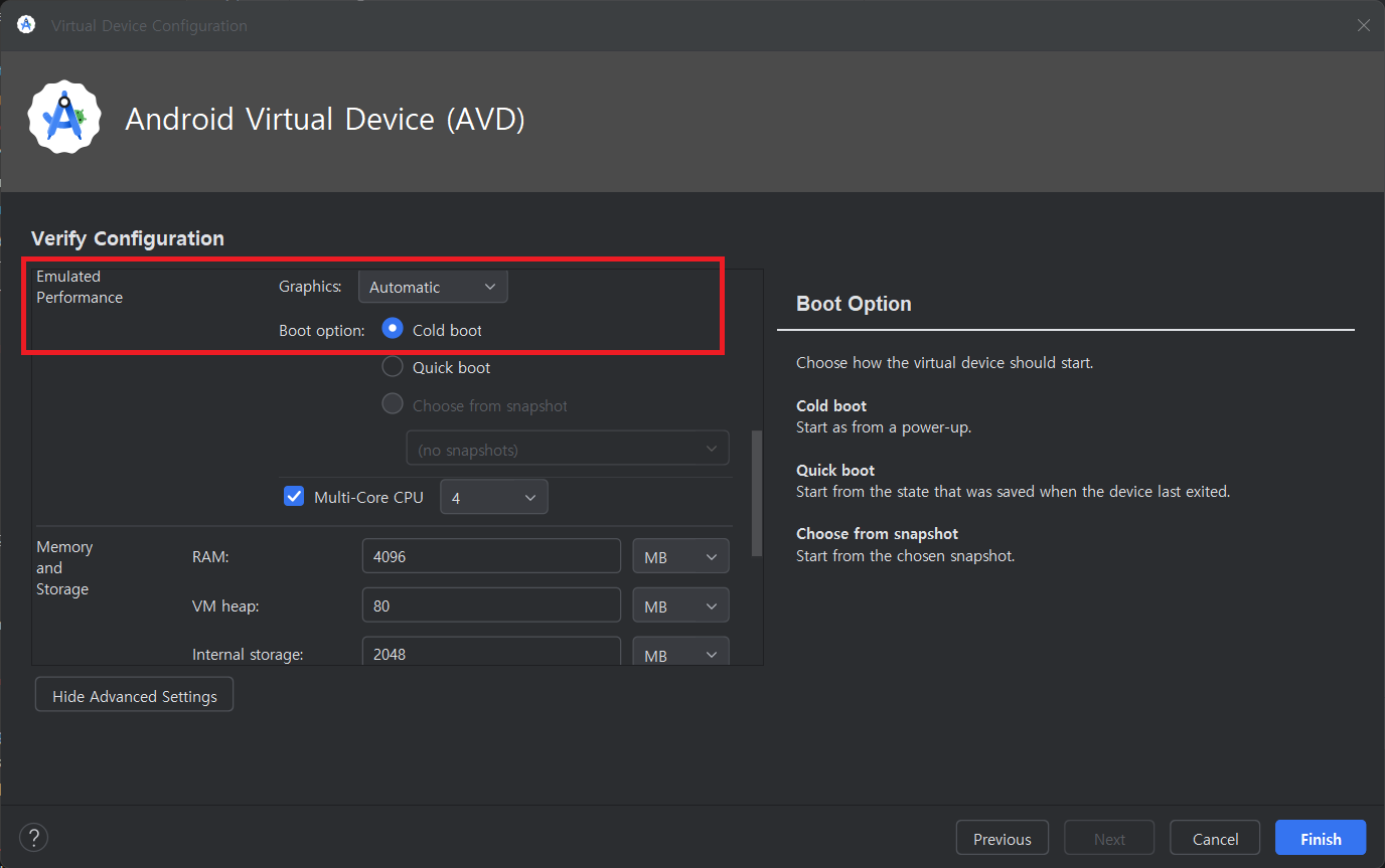 In the Emulated Performance section, set the Graphics option to Hardware and select Cold boot for the Boot option.